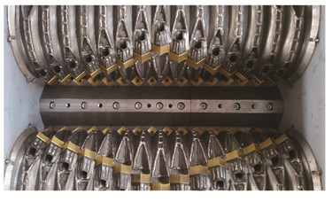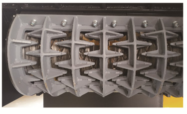 兩根相對(duì)旋轉(zhuǎn)的破碎軸上配備針對(duì)特定用途而選用的刀具。